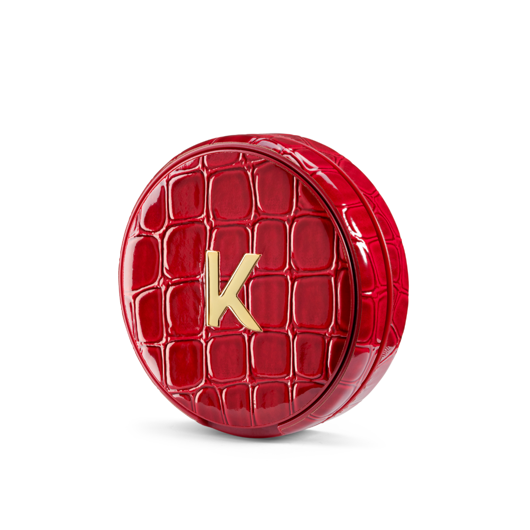 Rebel Kelly is a refillable can in red crocodile-patterned faux leather, featuring subtle gold detailing that exudes confidence.